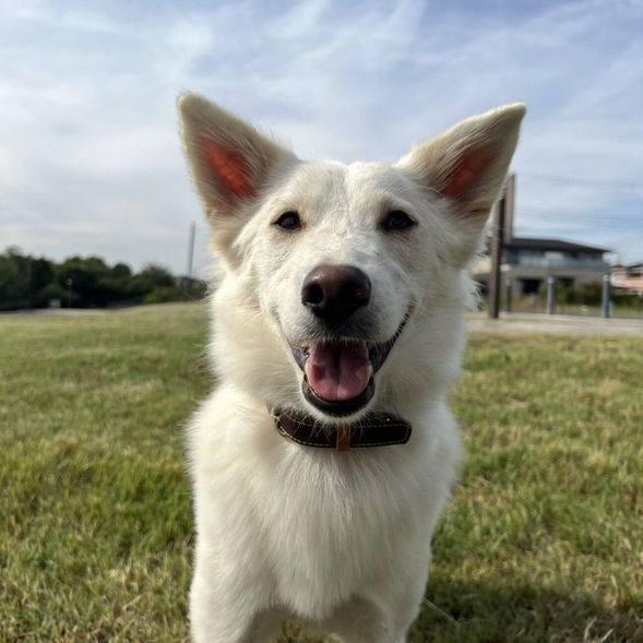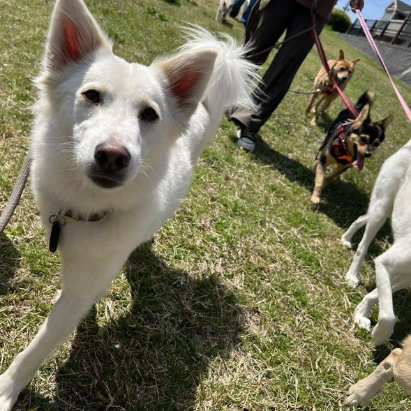 運動能力も抜群で、お散歩トレーニングは苦労しましたが、現在は指示を聞きながら楽しそうに歩いたり、気持ちよさそうな表情もしてくれるようになりました。大きな音や他の人の動きには敏感ですが、声かけはしっかり届く子なので、事前講習の中でお伝えしていけたらと思います。