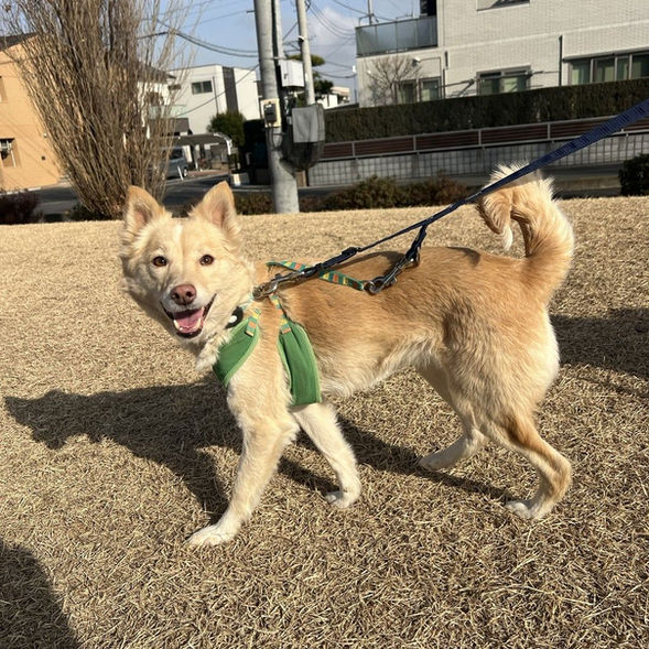 他の犬ともトラブルなく過ごしていますが、急にお尻の匂いを嗅がれたり、少し体がぶつかったりすると、驚いて悲鳴のような鳴き声をあげることがあります。少し怖がりでセンシティブな一面もありますが、基本的にはとても穏やかな子です。